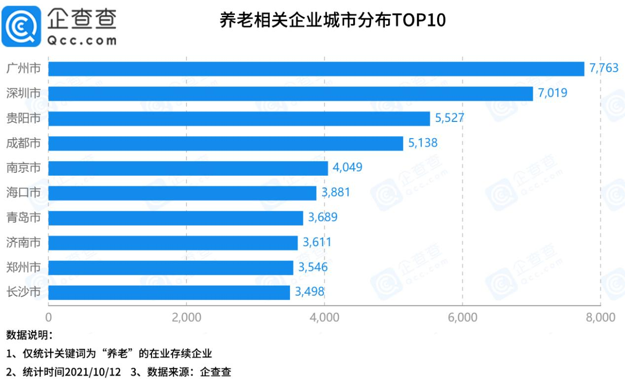 从城市分布来看,企查查数据显示,广州市拥有的养老相关企业最多,共7763家,占广东省总量的34.6%。深圳市以7019家位列第二,占广东省31.3%。贵阳市和成都市分别以5527家和5138家位列第二梯队。